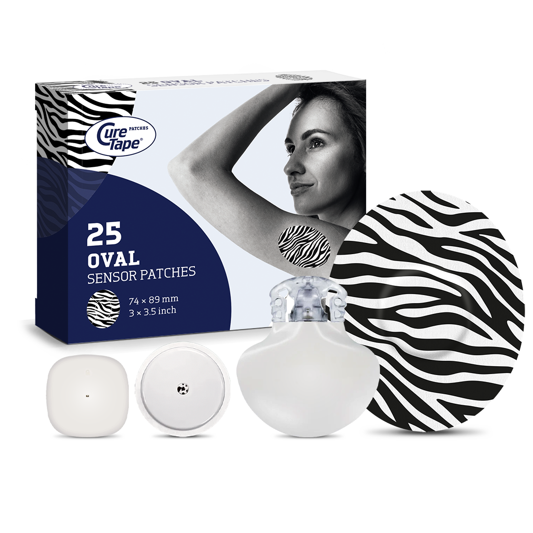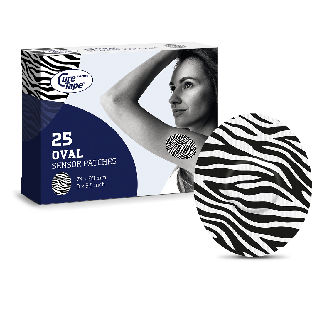 The oval sensor patch from CureTape is perfect for concealing your CGM sensor. One pack contains 25 oval overpatches measuring 74mm x 89mm.