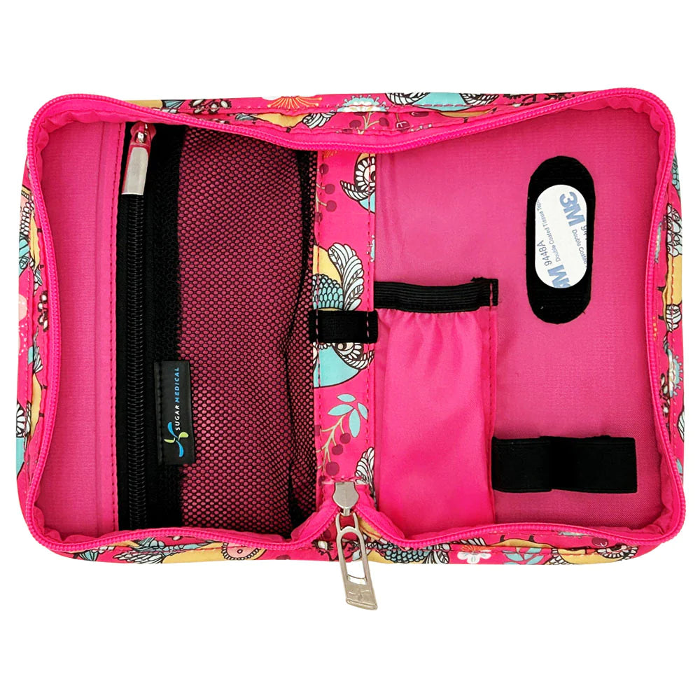 Avec cet étui rembourré, vous avez toujours vos accessoires importants pour le diabète à portée de main. Le sac pour diabète est disponible dans des designs sympas et a l'air super élégant ! Fini les sacs à diabète ennuyeux. Transportez vos fournitures essentielles pour le diabète dans ce sac élégant. Vous n’avez plus besoin de chercher dans votre sac des fournitures pour le diabète distinctes ; à partir de maintenant, vous trouverez tout ce dont vous avez besoin dans ce sac pratique. Fixez votre lecteur de glycémie au sac à l'aide de la fermeture Velcro pratique. Ce sac contient à la fois un récipient exclusif pour les bandelettes de test et une poche intérieure qui offre de la place pour 2 stylos à insuline ou comprimés de glucose. Une poche en filet pour les seringues, les tampons alcoolisés, les médicaments et plus encore. Les boucles élastiques vous permettent de ranger rapidement vos bandelettes de test, vos flacons d'insuline et votre autopiqueur. À l'extérieur, vous trouverez un espace de rangement pour votre carte d'identité ou votre téléphone portable. L'étui est d'une taille pratique à emporter avec vous, est livré avec une dragonne amovible et offre suffisamment d'espace de rangement pour tous vos articles liés au diabète. DIMENSIONS : environ 17,5 cm L x 11,5 cm H x 2,5 cm P COULEUR : Floral MATÉRIAU : nylon lavable CARACTÉRISTIQUES:- Le lecteur de glycémie est fixé au sac avec du velcro