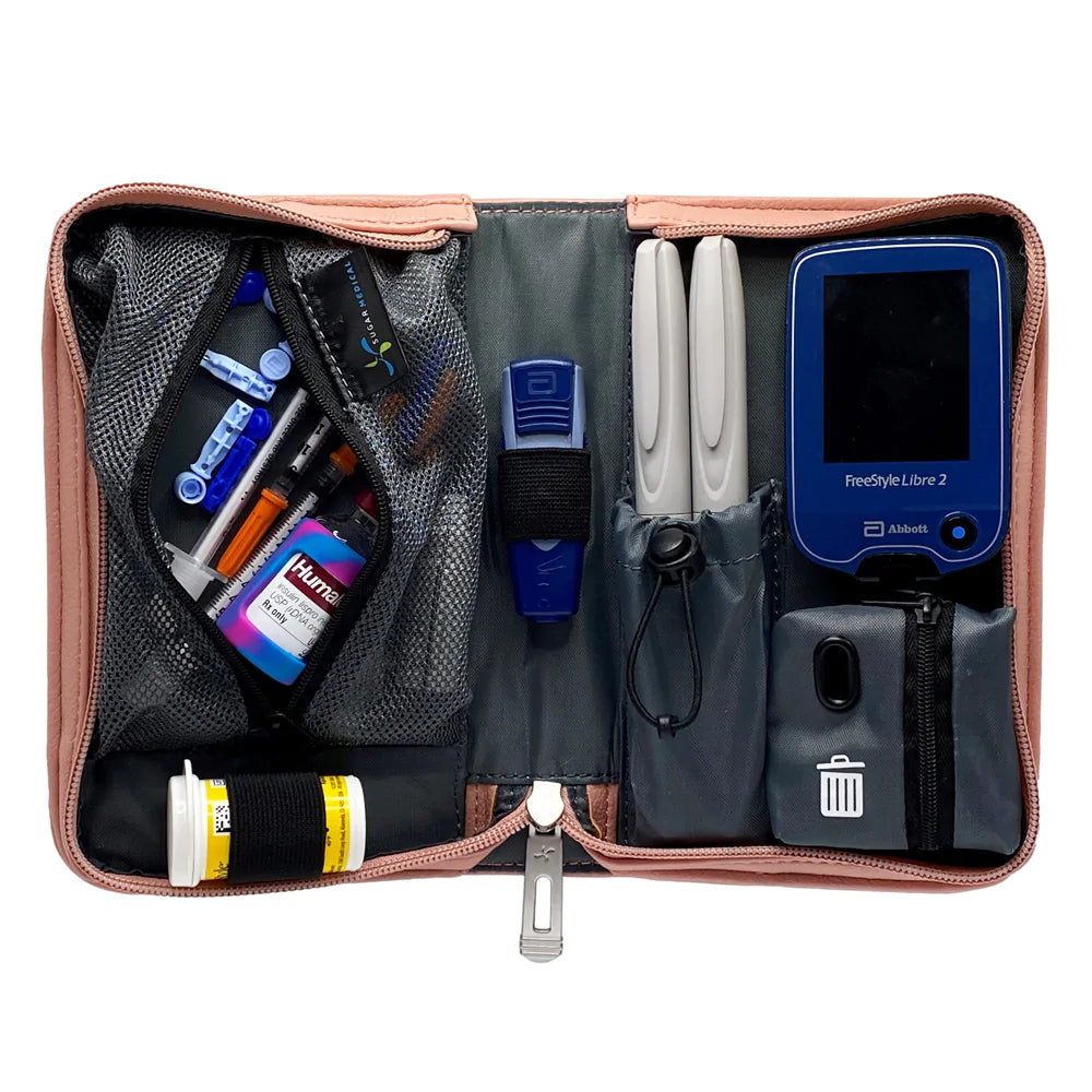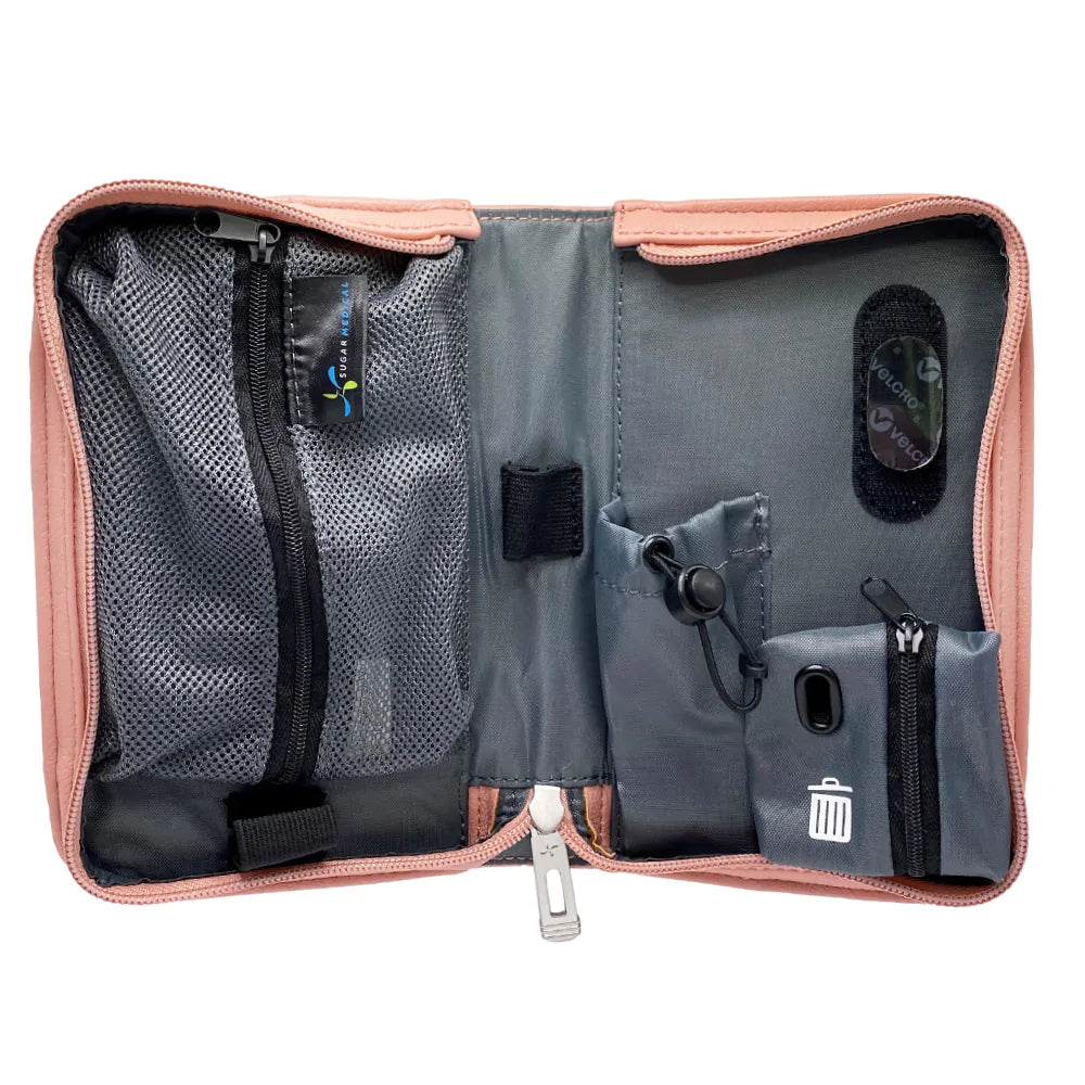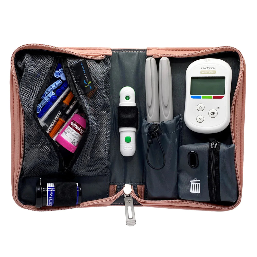 Avec cet étui rembourré, vous avez toujours vos accessoires importants pour le diabète à portée de main. Le sac pour diabète disponible en cuir grainé végétalien cool est super élégant ! Fini les sacs à diabète ennuyeux. Transportez vos fournitures essentielles pour le diabète dans ce sac élégant. Vous n’avez plus besoin de chercher dans votre sac des fournitures pour le diabète distinctes ; à partir de maintenant, vous trouverez tout ce dont vous avez besoin dans ce sac pratique. Fixez votre lecteur de glycémie au sac à l'aide de la fermeture Velcro pratique. Ce sac contient à la fois un récipient exclusif pour les bandelettes de test et une poche intérieure qui offre de la place pour 2 stylos à insuline ou comprimés de glucose. Une poche en filet pour les seringues, les tampons alcoolisés, les médicaments et plus encore. Les boucles élastiques vous permettent de ranger rapidement vos bandelettes de test, vos flacons d'insuline et votre autopiqueur. A l'extérieur, vous trouverez un espace de rangement pour votre carte d'identité. L'étui est d'une taille pratique à emporter avec vous, est livré avec une dragonne amovible et offre suffisamment d'espace de rangement pour tous vos articles liés au diabète. DIMENSIONS : environ 17,5 cm L x 11,5 cm H x 2,5 cm P (7,5" x 5" x 1,75") COULEUR : Rose MATÉRIAU : cuir grainé végétalien CARACTÉRISTIQUES:- Extérieur luxueux en cuir grainé végétalien