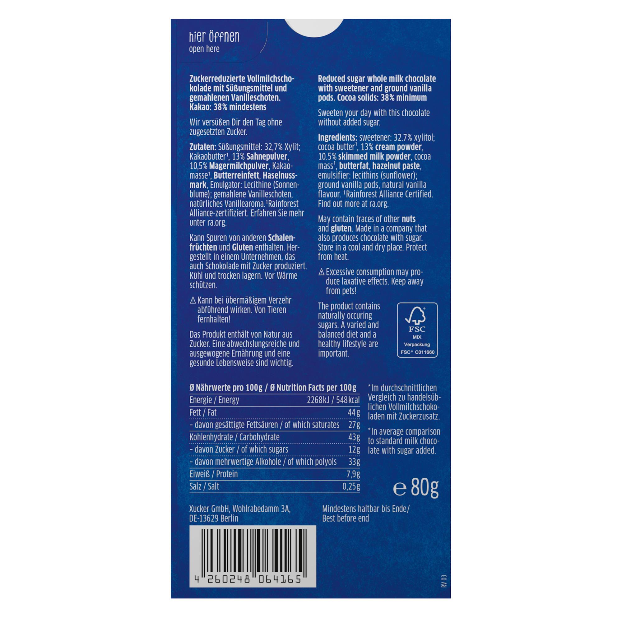 Chocolat au lait à teneur réduite en sucre avec édulcorant et gousses de vanille moulues. Cacao : 38% minimum.